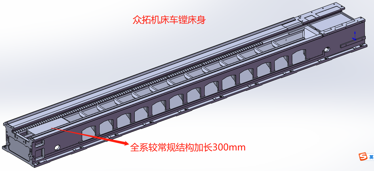 車鏜床結(jié)構(gòu)拖板相對(duì)于普通結(jié)構(gòu)拖板進(jìn)行了充分的加強(qiáng):拖板跨度加大、厚度加厚、燕尾跨度及高度增加、拖板后側(cè)增加安裝鏜桿支架底座的安裝面并加大了厚度;
