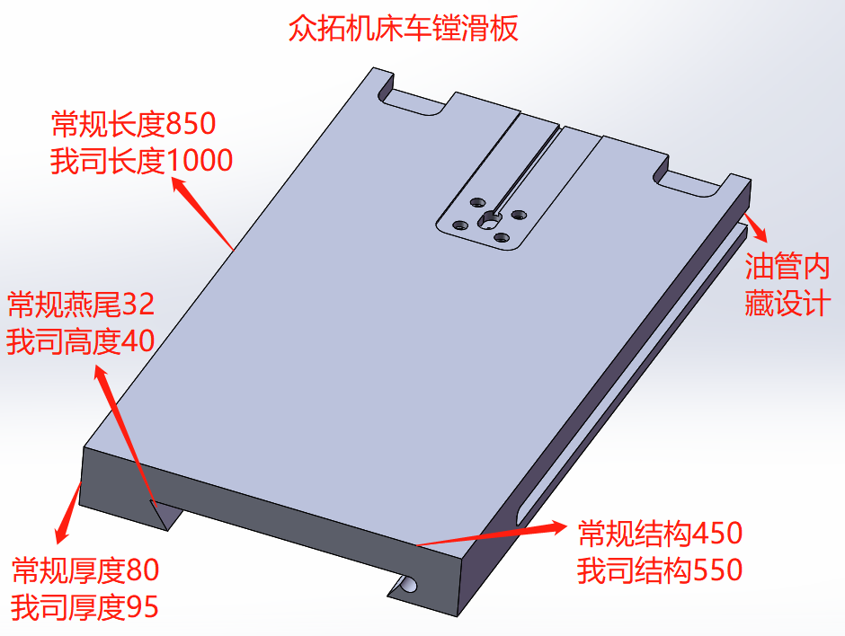 車床結(jié)構(gòu)拖板相對(duì)于普通結(jié)構(gòu)拖板進(jìn)行了充分的加強(qiáng):拖板跨度加大、厚度加厚、燕尾跨度及高度增加、拖板后側(cè)增加安裝鏜桿支架底座的安裝面并加大了厚度;為設(shè)備的內(nèi)孔鏜削加工提供足夠的剛性支撐。拖板絲杠中置,絲桿軸承支座裝配時(shí)充分找正,并采用預(yù)拉伸結(jié)構(gòu),提高了剛性及穩(wěn)定性。